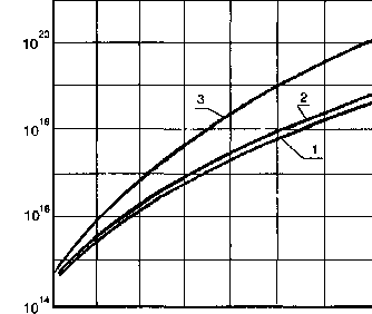 На рис. 2 приведены графики зависимостей концентрации электронов для различных температур для облака толщиной 10 м. Кривая 7 рассчитана по формуле Саха для ионизации воздуха при 1 кгс/см2 . Кривая 3 получена на основании методик [3, 4]. Кривая 2 построена на основании экспериментальных работ. Из приведенных результатов можно сделать вывод, что концентрация свободных электронов в плазменном облаке, образующемся при взрыве ОДС, составляет величину не менее 1017 1/м3 , и может быть с удовлетворительной степенью точности определена теоретически по уравнениям Саха и методикам [3, 4].
