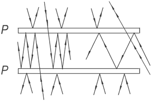P-частицы, так как они отражаются от P-пластинок, могут попасть в пространство между пластинками только сбоку. В зависимости от угла падения они покидают это пространство тотчас или же после одного или больше отражений. Эти частицы, казалось бы, могут внести свою долю в возникающую между пластинками силу отталкивания. Однако возникающие за их счет силы давления изнутри полностью уравновешиваются силами давления этих частиц на P-пластинки снаружи (Подробно последнее утверждение будет рассмотрено при обсуждении гравитации, рис.9). Таким образом можно утверждать, что силы отталкивания между P-пластинками вызываются только воздействием E-частиц.