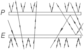 Точно такой же процесс происходит в пространстве между E-пластинками с тем отличием, что P- и E-частицы меняются ролями.