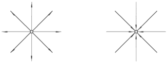 Рис. 5. Е-отклонение от нулевого потока вызывает противоположное впечатление: а) протон кажется стоком; б) электрон кажется источником