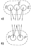 Представим теперь для удобства рассмотрения электроны и протоны в виде плоских зеркально гладких одинаковых по форме пластинок. (Этим не утверждается и не предполагается, что электроны и протоны имеют подобную форму. Их можно представлять и традиционно в виде небольших шариков, от этого ничего принципиально не изменится, но рассмотрение станет намного сложней и гораздо менее наглядным.) Пластинку-протон обозначим буквой P, а пластинку-электрон буквой E. Движение P-частиц обозначим лучами с одной стрелкой, а движение E-частиц – лучами с двойной стрелкой (со сдвигом стрелок вдоль луча).