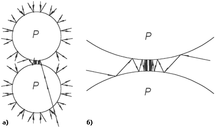 Рис. 7. Силы отталкивания возникают в самом узком месте зазора между двумя одноимённо заряженными шарами (например, между двумя протонами): а) уменьшено; б) увеличено