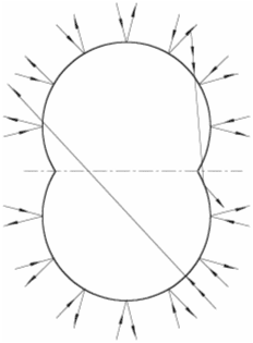 Положение меняется, если предположить, что протоны соприкасаются (сдавлены) друг с другом, причем так, что образуют сравнительно большую площадь соприкосновения (рис.8). E-частицы могут только тогда образовать силы отталкивания, если, пройдя через один из протонов и превратившись в P-частицы, столкнутся с поверхностью второго протона. Совершенно очевидно, что с ростом поверхности соприкосновения протонов, резко уменьшается число подобных E-частиц. Зато резко возрастает результирующая сил прижатия протонов друг к другу, возникающих за счет отражения от поверхности протонов P-частиц (рис.8). Сравнивая рис.7а и 8, можно с уверенностью сказать, что при достаточной величине площади контакта силы прижатия (притяжения) во много раз превышают по величине максимально возможную силу отталкивания двух протонов.