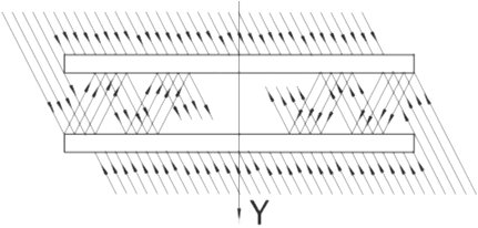 При такой постановке задачи можно рассмотреть взаимодействие указанных частиц с двумя нейтральными одинаковыми параллельными пластинками. Из рис.9 видно, что реакция частиц летящих не под прямым углом к пластинкам в некотором определенном и ему противоположном направлении, в результате отражения от обеих пластинок, всегда уравновешивается на каждой из пластинок. (Рис.9 показывает, разумеется, только частицы, летящие под одним из двух противоположных направлений, однако легко убедиться, что это условие выполняется для любого из двух противоположных направлений). Не уравновешиваются только реакции частиц, летящих под прямым углом к поверхности пластинок, или параллельно оси Y, т.е. внутри телесного угла, равного нулю. Только реакция этих частиц могла бы создать силу притяжения или гравитационную силу.