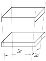 Рис. 11. Только гравитоны, летящие внутри телесного угла 2α, могут привнести вклад в создание притягивающей силы между двумя нейтральными пластинками