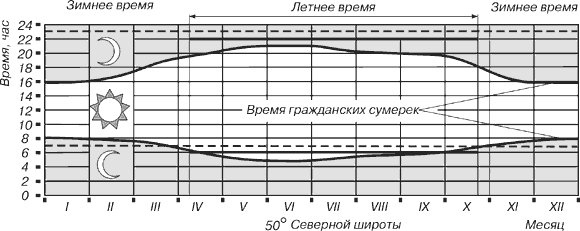 На рис.1 показано изменение светлого и темного времени суток в течение года для широты 50° (широта Киева). Границей между светлым и темным временем принято считать начало или конец так называемых гражданских сумерек, то есть времени, когда Солнце опустилось за горизонт на 6° [2]. По вечерам к этому моменту на улицах города следует включать освещение. На графике указано солнечное истинное время (истинное солнечное время начинается и заканчивается в полдень, т.е. когда светило проходит через меридиан и стоит максимально высоко).