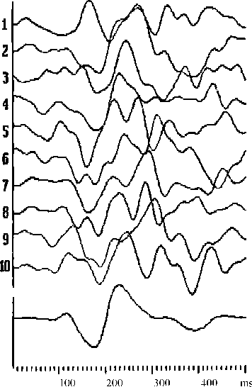 | Рис.2. Верхние 10 кривых v единичные вызванные потенциалы, выделенные из первых 10 последовательных реализаций в серии из 75 предъявлений зрительного стимула. Нижняя кривая v усредненный по всей серии ответ. Отведение P3. | ![]() |