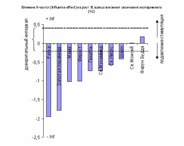 В результате удалось установить, что большинство использованных частот оказывают значительное угнетающее действие на культуру St. aureus. Слабо-стимулирующий характер К-воздействия достоверно проявился у всех трех кэн-оператовров только при работе частотой Фарун-будда. Недостоверные "выбросы" частоты Св. Мухаммед в область стимулирующего К-воздействия у оператора К1 следует отнести к артефактам вплоть до получения повторных схожих результатов на статистически достоверном уровне. При анализе первого блока графиков устойчивый эффект "отложенного подавления" регулярно отслеживался в работе оператора К3. Обязательная стартовая стимуляция роста культуры в сравнении с контролем, четко проявлялась в первые 3-5 часов роста культуры, тогда как типичный угнетающий характер К-воздействия на St.aureus начинал проявляться во второй фазе эксперимента где и обладал повышенной мощностью. Максимальной величины подавляющий эффект К-воздействия достигался во второй трети временного интервала наблюдения, тогда как до этого момента все частоты оператора К3 работали на слабую стимуляцию роста St. aureus.