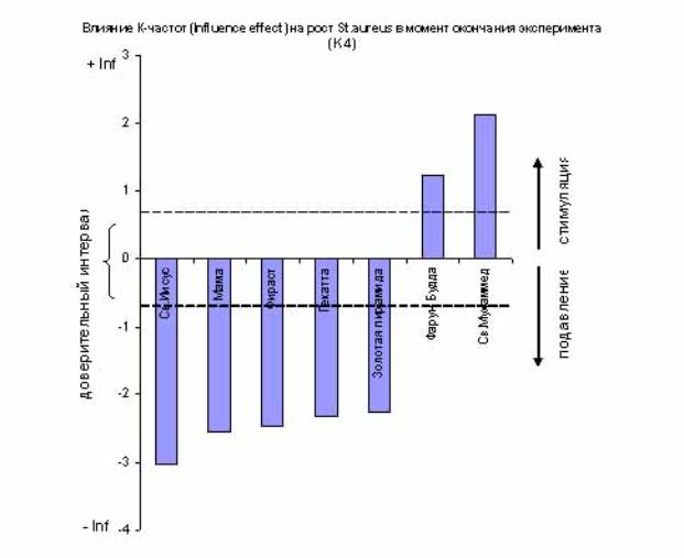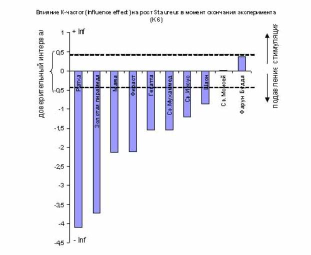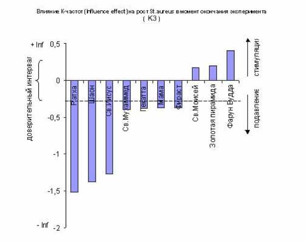 На рисунках 1-3 размещены кэн-частоты с эффектами выше и ниже среднего контроля (ось 0). Эти графики наиболее полно отображают эффект воздействия (Inf. еffect) кэн-частот на развитие St.aureus. Алгоритм расчета заключался в отображении разницы (Inf.) между средним контролем и эффектностью воздействия кэн-частоты с обратным знаком. Из сказанного следует, что Inf может принимать как положительные, так и отрицательные значения. Пунктиром нанесены верхняя и нижняя границы доверительного интервала. Длинна столбцов иллюстрирует силу угнетения или стимуляции роста St.aureus. Согласно правилам статистики, все величины, попадающие внутрь этого интервала считаются неотличимыми от нулевой линии, т.е. недостоверными. Из приведенных диаграмм явно видны все статистически достоверные эффекты угнетающего К-воздействия , которые изображены ниже нулевой прямой, и все статистически достоверные результаты стимулирующего К-воздействия, которые расположены выше нулевой прямой но, в то же время, выходят за пределы верхней границы доверительного интервала (верхняя пунктирная линия).
