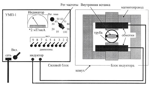 Индуктор состоит из магнитопровода, изготовленного из трансформаторного железа, между полюсами которого помещена труба из нержавеющей стали. Внутри трубы размещена вставка из трансформаторного железа- магнитный сердечник. Для возбуждения магнитного поля на полюса надеты катушки из провода диаметром 1,2 мм по 400 витков.