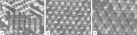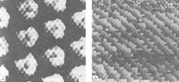 С помощью различных сканирующих микроскопов в настоящее время наблюдают за атомной структурой поверхностей монокристаллов металлов, полупроводников, высокотемпературных сверхпроводников, органических молекул, биологических объектов. На рис. 1 показана реконструированная поверхность нижней террасы грани (100) монокристалла кремния [6]. Серые кружки являются образами атомов кремния. Темные области являются локальными нанометровыми дефектами. На рис. 2 приведена атомная структура чистой поверхности грани (110) серебра (левая рамка) и той же поверхности, покрытой атомами кислорода (правая рамка) [7]. Оказалось, что кислород адсорбируется не хаотично, а образует достаточно длинные цепочки вдоль определенного кристаллографического направления. Наличие сдвоенных и одинарных цепочек свидетельствует о двух формах кислорода.