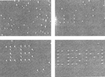 Новые микроскопы полезны не только при изучении атомно-молекулярной структуры вещества. Они оказались пригодными для конструирования наноструктур. С помощью определенных движений острием микроскопа удается создавать атомные структуры. На рис, 5 представлены этапы создания надписи "IBM" из отдельных атомов ксенона на грани (110) монокристалла никеля [12]. Движения острия при создании наноструктур из отдельных атомов напоминают приемы хоккеиста при продвижении шайбы клюшкой. Представляет интерес создание компьютерных алгоритмов, устанавливающих нетривиальную связь между движениями острия и перемещениями манипулируемых атомов на основе соответствующих математических моделей. Модели и алгоритмы необходимы для разработки автоматических "сборщиков" наноконструкций.
