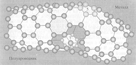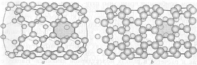 Углеродные нанотрубки. Из углерода можно получить молекулы с гигантским числом атомов [19]. Такая молекула, например С=1000000, может представлять собой однослойную трубку с диаметром около нанометра и длиной в несколько десятков микрон (рис. 7). На поверхности трубки атомы углерода расположены в вершинах правильных шестиугольников. Концы трубки закрыты с помощью шести правильных пятиугольников. Следует отметить роль числа сторон правильных многоугольников в формировании двухмерных поверхностей, состоящих из