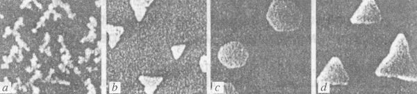 размерностью 1.78 (рис. 9a), либо компактные острова с платоновыми формами в виде правильных треугольников (рис. 9b, 9d) и шестиугольников (рис. 9с), причем одинаково ориентированных относительно кристаллографических осей. Так, при температуре 400 К вершины треугольников смотрят "вниз" (рис. 9Ь). При температуре 455 К растущие острова принимают форму правильных шестиугольников (рис. 9с). При более высокой температуре снова образуется правильная треугольная форма островов, но на этот раз их вершины смотрят "вверх" (рис. 9d). Форма и ориентация треугольных островов являются устойчивыми. Дальнейшая подача атомов приводит к режиму трехмерного роста, в результате которого растущий слой всегда не однороден и имеет пирамидальную трехмерную структуру.
