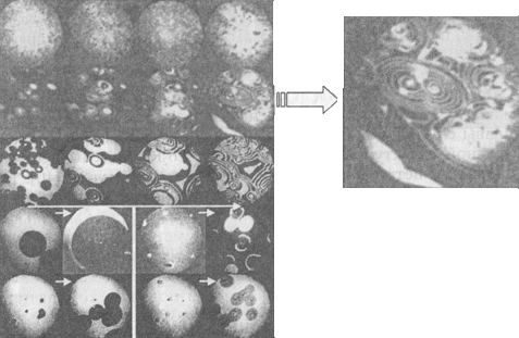 Более сложные примеры нетривиального динамического поведения открытых неидеальных систем дают модельные реакции гетерогенного катализа на определенных гранях монокристаллов благородных металлов (Pt(111), Pt(100), Pt(110), Pt(210), Pd(111), Pd(110)) при низких парциальных давлениях в газовой фазе. Это реакции окисления монооксида углерода (СО) кислородом (О2 ), а также редукция монооксида азота (NO) водородом (Н2 ), аммиаком (NH3 ) и монооксидом углерода. Перечисленные реакции играют существенную роль в экологической проблеме дожигания ядовитых выбросов (NO, CO и др.) двигателей внутреннего сгорания и тепловых электростанций. Исследования, выполненные в последние годы [42-50], открыли восхитительную нано- и мезодинамику этих систем. Обнаружены фазовые переходы типа порядок-беспорядок, сопровождающиеся образованием сверхструктур в монослое адсорбата, фазовые переходы типа расслоения на фазы, спонтанная и индуцированная адсорбатом реконструкция поверхности граней монокристаллов, коррозия катализатора. Процессы пространственно-временной самоорганизации, протекающие в нанометровой шкале размеров, тесно связаны с аналогичными явлениями, наблюдающимися с помощью эмиссионной фотоэлектронной микроскопии в микрометровом диапазоне. К таким явлениям относятся микрометровые спиральные, стоячие и триггерные 0олны, двойная метастабильность, химическая турбулентность. На рис, 11 представлены результаты исследования пространственно-временной самоорганизации в реакции окисления монооксида углерода на грани монокристалла Pt(210) методом эмиссионной фотоэлектронной микроскопии [47]. В каждой рамке (380 х 380мm) показано пространственное распределение адсорбированных молекул СО (светлые области) и атомов кислорода (темные области) на поверхности катализатора для различных значений парциальных давлений СО и кислорода в газовой фазе при постоянной температуре поверхности. Отчетливо видны спиральные волны и автоволны фазового перехода типа расслоения на фазы, явления двойной метастабильности и т. п.