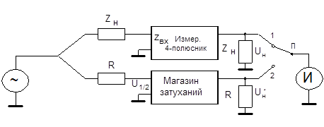 Погрешность измерения рабочего затухания , как и в предыдущем случае, определяется погрешностью измерений уровней напряжений U1 и Uн и составляет 0,1-1,8 дБ. С целью повышения точности измерений методом Z пользуются схемами сравнения симметричных и несимметричных четырёхполюсников. Рабочее затухание измеряемого четырёхполюсника сравнивается с затуханием образцового магазина затухания МЗ. Процесс измерения состоит в регулировке затухания образцового МЗ до тех пор, пока напряжение на его выходе U`н не станет равным напряжению на нагрузке Uн, что регистрируется индикатором с высоким входным сопротивлением с помощью переключателя П. Рабочее затухание определяется из следующих соотношений: