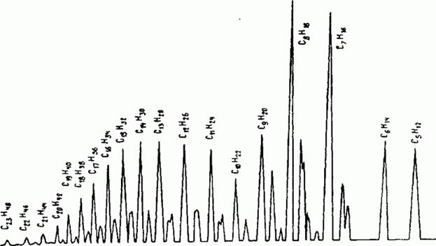 Рис 4. Типичная хроматограмма жидких продуктов синтеза углеводородов из продуктов газификации биомассы. Газ-носитель азот, капиллярная колонка длиной 50 м, жидкая фаза OV-101, 20—220° С, 8° С/мин