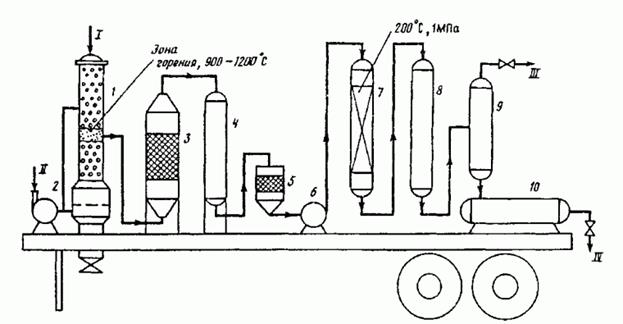 Рис. 5. Схема установки для получения жидкого топлива из растительной биомассы: 1 — газогенератор; 2 — воздушный компрессор; 3 — адсорбер; 4 — холодильник; 5 — фильтр тонкой очистки; 6 — компрессор; 7 — реактор; 8 — теплообменник; 9 — сепаратор; 10 — приемник жидкого топлива. Линии: I — биомасса, II — воздух, III — отработанный газ, IV — синтетическое жидкое топливо