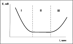Исходя из предлагаемой теории, потенциал хроматографической системы будет развиваться во времени в 3 этапа.