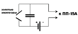 Из рисунка видно, что устройство состоит из электродов, которые замыкает падающая капля элюента. Момент замыкания отражается импульсом в электрической цепи, а импульс регистрирует счетчик импульсов ПП-15А. Конденсатор в схеме нужен для того, чтобы сократить время импульса, так как слишком длительные импульсы прибор не регистрирует.