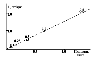 Метод измерения массовой концентрации ионов аммония основан на разделении катионов вследствие их различной электрофоретической подвижности в процессе миграции по кварцевому капилляру в бензимидазольном электролите под действием электрического поля с последующей регистрацией разницы поглощения ионами аммония и электролитом ультрафиолетового излучения на длине волны 254 нм. Градуировку анализатора проводят, анализируя градуировочные растворы ионов аммония в деионизованной воде, приготовленные из ГСО состава водного раствора ионов аммония с номинальным значением массовой концентрации 0,1 г/дм3 . На рис.1 приведена градуировочная зависимость площадей пиков от массовых концентраций иона аммония.