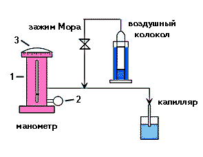 В нашем случае манометр используется только для создания давления, необходимого для отрыва пузырька воздуха от капилляра. Однако процесс выдавливания пузырька воздуха сопровождается некоторым изменением уровня жидкости в сосуде-датчике 2, что безусловно искажает результаты измерения давления. Для предотвращения этого эффекта служит воздушный колокол, с помощью которого через зажим Мора можно корректировать негативное изменение уровня жидкости в манометре.