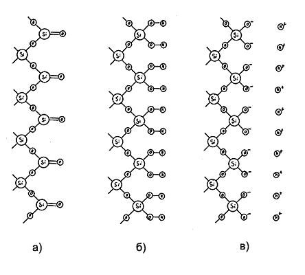 Обратимся к процессам, происходящим на границе раздела двух фаз: внутренней поверхности кварцевого капилляра и водного раствора электролита, заполняющего капилляр. На свежеобразованной (ювенильной) поверхности плавленого кварца (SiO2 )находятся главным образом силоксановые группы (рис. 1а). При контакте с парами воды или водными растворами силоксановые группы, обладающие двойными связями, оказываются неустойчивыми и, присоединяя молекулу воды, образуют силанольные группы (рис. 1б). При контакте поверхности кварца с водными растворами, силанольные группы диссоциируют с отщеплением ионов Н+ (рис. 1в). Степень диссоциации зависит от температуры и состава водного раствора, в частности от величины рН. При рН> 2,5 на поверхности кварца образуются диссоциированные силанольные группы, которые создают отрицательный поверхностный заряд.