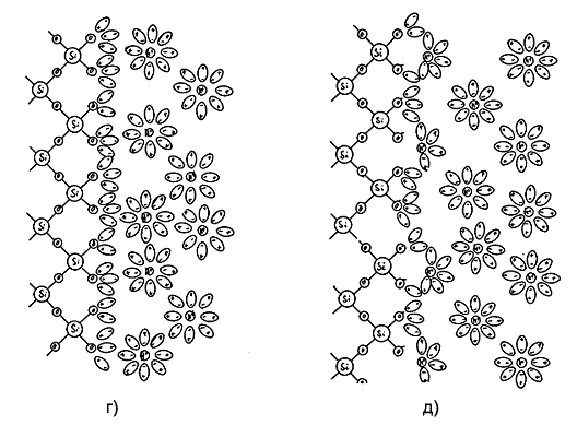 Рис. 1. Схема процессов, происходящих на поверхности кварца а) ювенильная (свежесозданная) поверхность кварца б) образование силанольных групп на поверхности кварца в) диссоциация силанольных групп в водном электролите г) гидратация образовавшихся ионов д) связывание части катионов с поверхностью, формирование двойного электрического слоя |