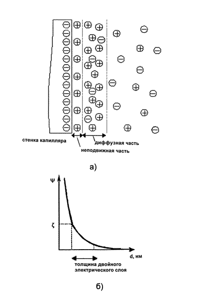 Вследствие этого процесса в электролите, заполняющем капилляр, возникает направленное перемещение массы жидкости, которое вызвано приложенной разностью потенциалов, при этом вся масса жидкости (за малым исключением приповерхностного слоя) перемещается с одинаковой скоростью, т.е. формируется плоский профиль скоростей. Это очень важное обстоятельство, которое позволяет получить чрезвычайно высокую разрешающую способность метода, поэтому на него надо обратить особое внимание.