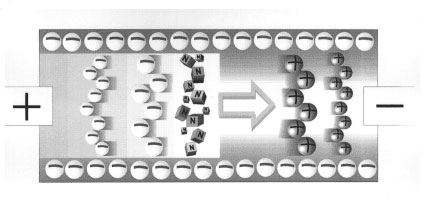 Как правило, в приборах капиллярного электрофореза ЭОП направлен от входного конца капилляра к детектору поэтому, при использовании кварцевого капилляра, разность потенциалов устанавливают таким образом, что входной конец капилляра имеет положительную полярность (анод), а детектор устанавливается вблизи катода. Если теперь в капилляр со стороны анода ввести небольшой объем раствора пробы, то ЭОП будет переносить зону пробы к катоду, и она некоторое время будет находиться в капилляре под воздействием электрического поля высокой напряженности. В течение этого времени компоненты пробы, имеющие заряды и отличающиеся от компонентов рабочего буфера, будут перемещаться в соответствии с присущими им электрическими подвижностями, специфичными для каждого компонента. Катионные компоненты пробы, двигаясь к катоду, будут обгонять электроосмотический поток. Скорость их движения будет складываться из скорости ЭОП и скорости электромиграции, поэтому на выходе капилляра катионные компоненты будут появляться первыми и тем раньше, чем больше электрическая подвижность данного иона. Нейтральные компоненты пробы будут перемещаться только под действием ЭОП, и появятся на выходе, когда его достигнет зона пробы. Анионные компоненты перемещаются к аноду с различными скоростями. Некоторые из них, медленно мигрирующие, будут появляться вблизи детектора после выхода ЭОП, а те, чья скорость миграции по абсолютной величине превышает скорость ЭОП, рано или поздно выйдут из капилляра в прианодное пространство.