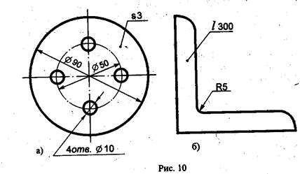 Если деталь имеет несколько одинаковых отверстий или других элементов (кроме скруглений), то наносится размер одного из них, а количество отверстий или других элементов указывают перед размерным числом, например 3 отв. 16 (рис. 10а).
