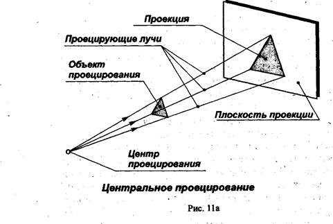 Различают центральное и параллельное проецирование. При центральном проецировании все проецирующие лучи исходят из одной точки - центра проецирования, находящегося на определённом расстоянии от плоскости проекций. На рис, 11а за центр проецирования условно взята электрическая лампочка. Исходящие от неё световые лучи, которые условно приняты за проецирующие, образуют на полу тень, аналогичную центральной проекции предмета.