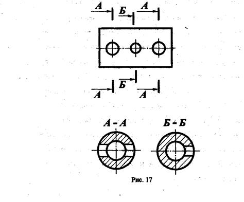 На одном чертеже может быть несколько разрезов (рис. 21). Но каждый из них должен быть целесообразным. Разрез обычно располагают в проекционной связи: фронтальный - на месте главного вида; профильный -на месте вида слева; горизонтальный - на месте вида сверху.