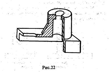 Для выявления внутреннего устройства детали, которая вычерчена во фронтальной диметрии, в ней вырезана передняя левая часть (рис. 22).