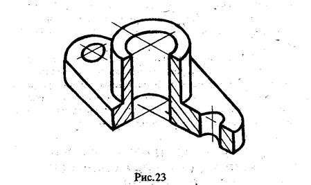 Разрез на аксонометрических изображениях деталей, имеющих симметричную форму, выполняют, как правило, с помощью секущих плоскостей, проходящих вдоль плоскости симметрии детали (рис. 23).