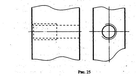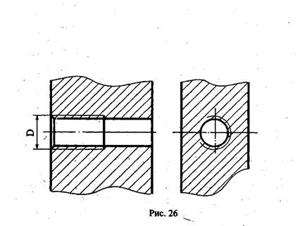 Резьбу в отверстии на разрезе показывают сплошными тонкими линиями по наружному диаметру и сплошными толстыми линиями по внутреннему диаметру. Штриховку на разрезе всегда доводят до сплошной толстой линии. Границу видимой резьбы проводят до линии наружного её диаметра и изображают сплошной толстой линией (рис. 26).