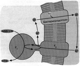 Рис. 4. Бактериородопсиновый фотосинтез со-лелюбивых архебактерий. Ионы 1-Г откачиваются из клетки бактериородопсином - белком, содержащим ретиналь в качестве хромофора, то есть группировки, поглощающей видимый свет. Ионы Н* возвращаются в клетку, двигаясь "под гору" через Н+ -АТФазный комплекс F0 F,. При этом оказывается, что Н+ - АТФаза катализирует обратную реакцию, то есть синтез АТФ, а не его гидролиз