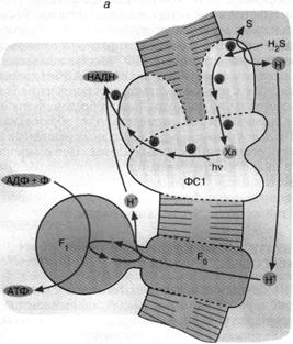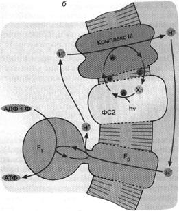 Рис. 5. Хлорофилльный фотосинтез зеленых серных (а) и пурпурных (б) бактерий: а - хлорофилл, связанный с особым белковым комплексом - фотосистемой 1 (ФС1), возбуждается квантом света и отдает электрон по цепи электронных переносчиков на НАД+ . Восстанавливаясь, НАД* связывает внутриклеточный ион НГ. Потеря электрона на хлорофилле компенсируется окислением сероводорода до серы и иона ИГ снаружи бактериальной клетки. Движение Н+ внутрь клетки через комплекс F0 F1 дает АТФ; б - хлорофилл, связанный с белком фотосистемы 2 (ФС2), поглощает квант света и запускает циклический перенос электронов. В этом процессе участвуют переносчики электронов ФС2 и дополнительного белкового комплекса III. Перенос электронов комплексом III сопряжен с откачкой ионов Н+ из клетки. Откачанные ионы I-Г возвращаются через комплекс F0 F, с образованием АТФ
