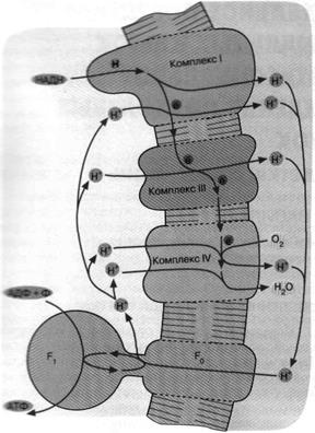 Рис.7. Механизм дыхательного фосфорилирования в аэробных бактериях и митохондриях. Ферментные комплексы I, III и IV катализируют перенос электронов от НАДН к О2 с образованием воды. Перенос электронов сопряжен с откачкой ионов Н*. Возвращение ионов Н+ через F0 F1 приводит к синтезу АТФ