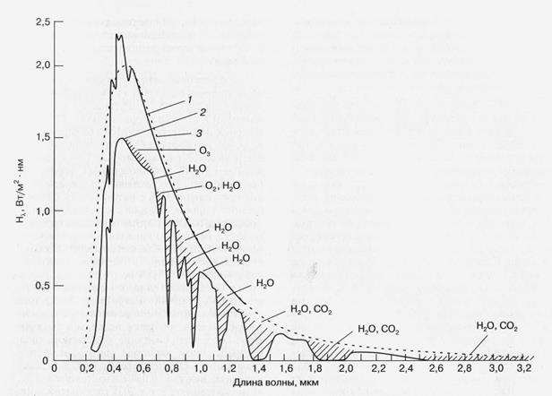 Рис. 1. Интенсивность падающего на Землю солнечного излучения (Нl ) в зависимости от длины волны. Заштрихованные области соответствуют ненаблюдаемым на уровне моря участкам спектра из-за их поглощения указанными компонентами атмосферы. 1 - Солнечное излучение за границей атмосферы, 2 - солнечное излучение на уровне моря, 3 - излучение абсолютно черного тела при 5900 К. (Справочник по геофизике и космическому пространству. Под ред. С.Л. Валлея и Мак Гроу-Хилла, Нью-Йорк, 1965).