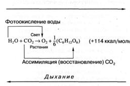 Фотосинтетическое образование О2 , сопровождающееся поглощением СО2 , в сочетании с появившейся возможностью аэробного дыхания, при котором происходит обратный процесс — потребление 02 , сопровождающееся освобождением СО2 , привело к образованию замкнутых циклов О2 и СО2 , имеющих глобальные масштабы. Сочетание этих циклов позволяет восполнять содержание как СО2 , так и О2 , а их участие в едином цикле "фотосинтез-дыхание" обеспечивает постоянное поступление энергии в биосферу (см. рис. 2).
