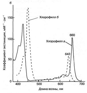 Как показано на рис. 3а, молекула хлорофилла состоит из порфиринового ядра, образованного тетрапиррольным кольцом с расположенным в центре атомом магния, и фитольного хвоста. Хлорофилл относится к классу веществ, называемых пигментами, то есть сильноокрашенных соединений, характеризующихся интенсивным поглощением видимого света. Было установлено, что система "легко возбудимых" сопряженных связей порфиринового кольца обусловливает высокую способность хлорофилла к поглощению света (рис. 36). Так, миллиметровый слой 1 мМ раствора хлорофилла поглощает около 90% падающего на него красного или синего света (зеленый свет поглощается менее эффективно, что и определяет зеленый цвет растений). Для хлорофилла, как и для других пигментов, характерно относительно длительное время, около 1(Г8 сек, нахождения в возбужденном состоянии, что важно для участия хлорофилла в фотохимических реакциях. У многих других пигментов, например, у производных хлорофилла, у которых центральный атом магния заменен на медь или марганец, это время гораздо ниже вследствие чрезвычайно быстрого перехода энергии электронного возбуждения в тепло.