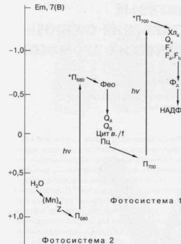 Рис. 5. Схематическое изображение фотосинтетической цепи переноса электрона в хлоропласах растений и цианобактерий. (Мп)4 - Комплекс из четырех атомов Мп, связанных с белками реакционного центра фотосистемы 2 (ФС-2); Z - вторичный донор электрона ФС-2, (остаток тирозина); Пбао - первичный донор электрона ФС-2 (димер хлорофилла); *П680 - возбужденное состояние хлорофилла П680 ; Фео - первичный акцептор электрона ФС-2, феофитин; QA и QB -акцепторы электрона хиноновой природы; цит в./ f - комплекс цитохромов, участвующих в переносе электрона от ФС-2 к фотосистеме 1 (ФС-1); Пц - пластоцианин (подвижный переносчик электрона); П700 - первичный донор электрона ФС-1 (димер хлорофилла); *П700 - возбужденное состояние П700 ;Хла -(хлорофилл) и Ох -(хинон), соответственно, первичный и вторичный акцепторы электрона ФС-1; Fx , Fa и Fb акцепторы электрона ФС-1 (Fe-S-центры); Фд - ферредоксинрастворимый переносчик электрона (Fe-S-содержащий белок); НАДФ+ - никотинамидаденин динуклеотид фосфат (конечный переносчик электронов, используемый вместе с АТФ в ассимиляции СО2 ), hv - квант света. По вертикальной шкале указаны приблизительные значения окислительно-восстановительных потенциалов переносчиков электрона при рН 7.