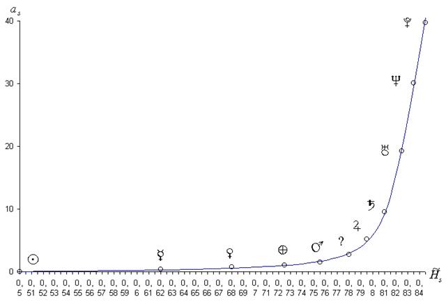 , а по оси ординат - большие полуоси главных планет Солнечной системы