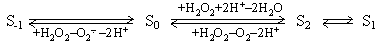 Особый интерес среди аналогов H2 O представляет пероксид водорода. В присутствии H2 O2 хлоропласты выделяют O2 в ответ на первый световой импульс [4]. Этот результат подтвержден в опытах с H2 18 O2 [5]. В темноадаптированных тилакоидах хлоропластов H2 O2 вызывает переход S1 → S-1 [4, 5]. При этом устанавливается соотношение S0 : S-1 : S1 , близкое к 0 : 6 : 4 [5]. Состояние S-1 стабильно и не релаксирует, по меньшей мере, в течение 15 мин [5]. Одиночный световой импульс вызывает переход S-1 /S1 → S0 /S2 , который инициирует темновую реакцию окисления H2 O2 с образованием O2 [4,5]. Как продемонстрировано в опытах с H2 18 O2 , весь O2 выделяется из H2 O2 [5], в расчете на 1 P680 после одиночной вспышки света выделяется более 20 молекул O2 . Эта реакция, подобная каталазной реакции, предположительно обусловлена восстановлением S2 до S0 посредством H2 O2 (E0 ' для O2 /H2 O2 равен 0,295 В) и последующим H2 O2 -зависимым окислением S0 до S2 (E0 ' для H2 O2 /H2 O равен 1,42 В). Реакции S-состояний, вызываемые H2 O2 , иллюстрирует схема (по [5]).