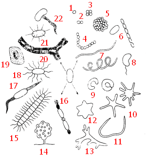 За последнее время среди прокариот обнаружены организмы, отличающиеся от описанных выше основных форм. Некоторые бактерии имеют вид кольца, замкнутого или разомкнутого в зависимости от стадии роста (рис.3, 9 ). У прокариот, в основном размножающихся почкованием, описано образование клеточных выростов (простек), число которых может колебаться от 1 до 8 и более (рис. 3, 10 ). Из природных субстратов выделены бактерии червеобразной формы и напоминающие шестиугольную звезду (рис. 3, 11, 12 ). Для некоторых видов характерно слабое или довольно хорошо выраженное ветвление (рис. 3, 13 ). Описаны прокариоты, обладающие морфологической изменчивостью, в зависимости от условий имеющие вид палочек, кокков или обнаруживающие слабое ветвление.