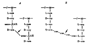 Пептидогликан, окружающий протопласт грамположительных эубактерий, — это по существу одна гигантская молекула, "сшитая" с помощью гликозидных и пептидных связей. Именно последние обеспечивают ей трехмерную пространственную организацию.