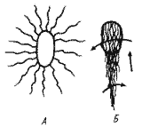 | Рис. 12. Клетка Salmonella typhimurium в состоянии покоя (А) и при движении (Б). Стрелками показано направление вращения и движения клетки |