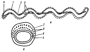 Необычная локализация структур, ответственных за движение, описана у спирохет (рис. 13). Трехслойная структура, окружающая клетку и называемая у спирохет наружным чехлом, аналогична наружной мембране клеточной стенки грамотрицательных эубактерий. Этот чехол окружает так называемый протоплазматический цилиндр, состоящий из пептидогликанового слоя клеточной стенки, ЦПМ и цитоплазматического содержимого. Протоплазматический цилиндр обвивается пучком нитчатых структур — аксиальных фибрилл. Число их колеблется от 2 до 100. Один конец каждой аксиальной фибриллы прикреплен вблизи полюса протоплазматического цилиндра, другой— свободный. Клетка содержит по два набора фибрилл, прикрепленных субполярно у каждого клеточного конца. Так как каждая аксиальная фибрилла тянется почти вдоль всей длины клетки, пучки фибрилл, прикрепленных у разных полюсов, в центральной части перекрываются.