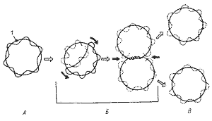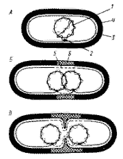 Деление молекулы ДНК (репликация) происходит по полуконсервативному механизму и в норме всегда предшествует делению клетки. С помощью электронного микроскопа установлено, что репликация ДНК начинается в точке прикрепления кольцевой хромосомы к ЦПМ, где локализован ферментативный аппарат, ответственный за репликацию. Часто можно обнаружить, что контакт ДНК с ЦПМ осуществляется посредством мезосом. Репликация, начавшаяся в точке прикрепления, идет затем в двух противоположных направлениях, образуя характерные для кольцевой хромосомы промежуточные структуры (рис. 17). Возникающие дочерние хромосомы остаются прикрепленными к мембране. Репликация молекул ДНК происходит параллельно с синтезом мембраны в области контакта ДНК с ЦПМ. Это приводит к разделению (сегрегации) дочерних молекул ДНК и оформлению обособленных хромосом (рис. 18).